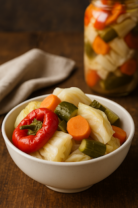 La tourshia, c’est ce petit bol de légumes marinés, croquants et acidulés, posé sur la table à côté d’une soupe chaude ou d’un plat mijoté. Elle apporte de la couleur et un goût qui réveille tout le reste.